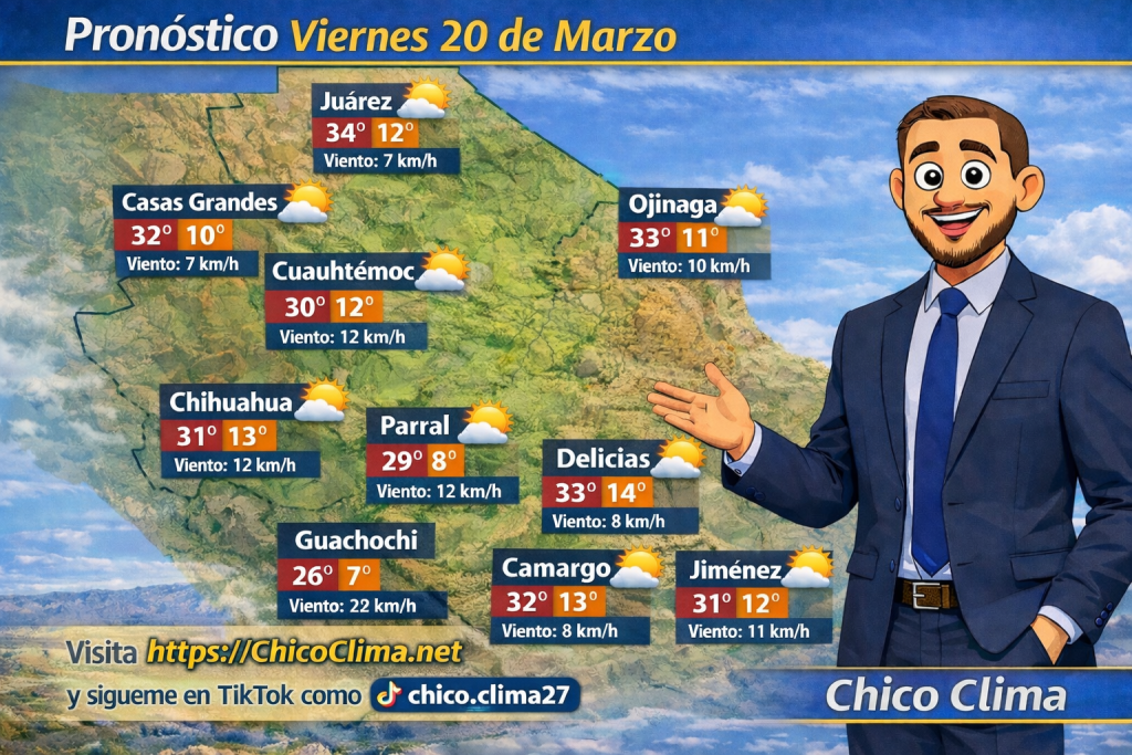 Este viernes 20 de marzo, el estado de Chihuahua registrará condiciones mayormente soleadas en gran parte de la región, con temperaturas cálidas durante la tarde y mañanas frescas.